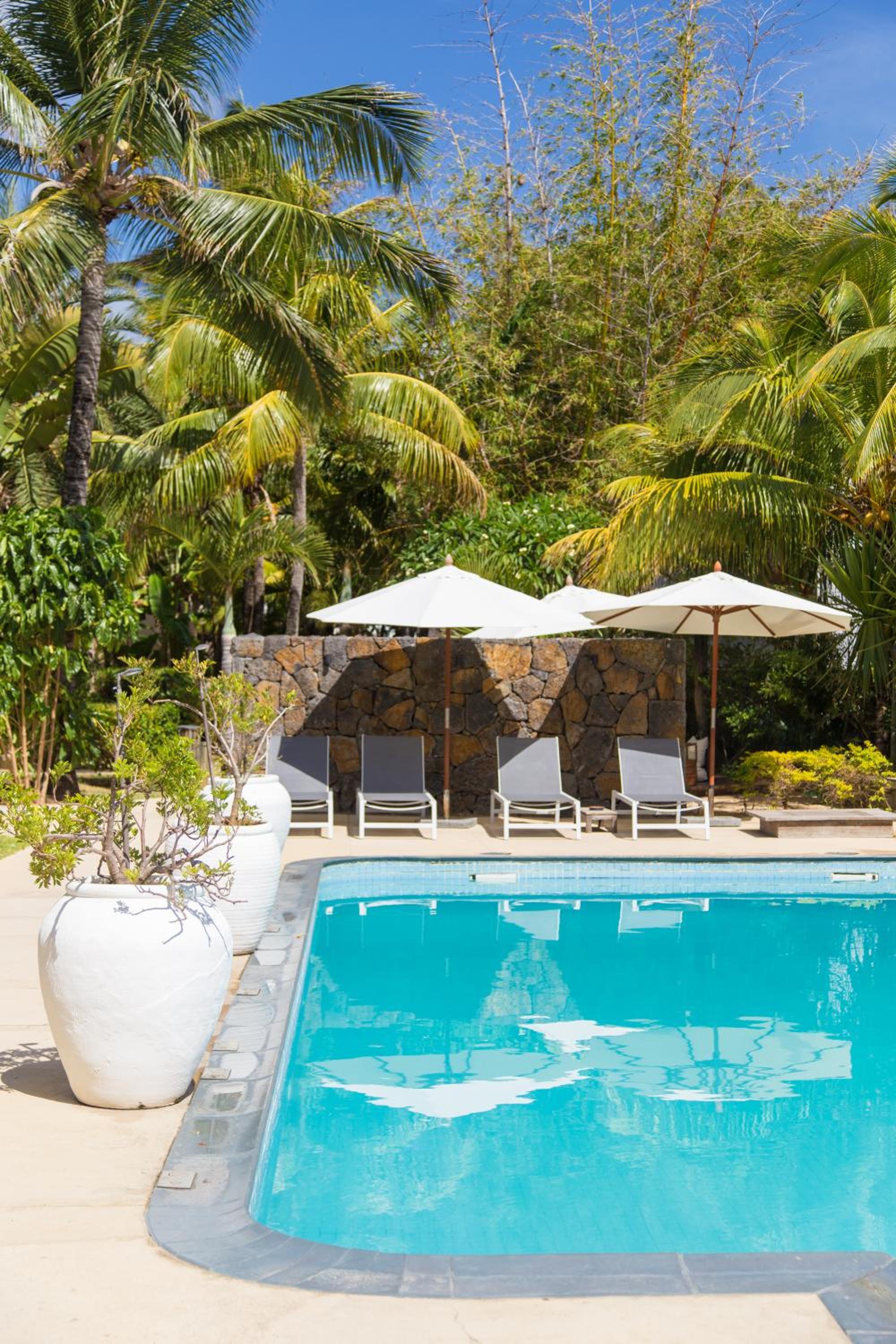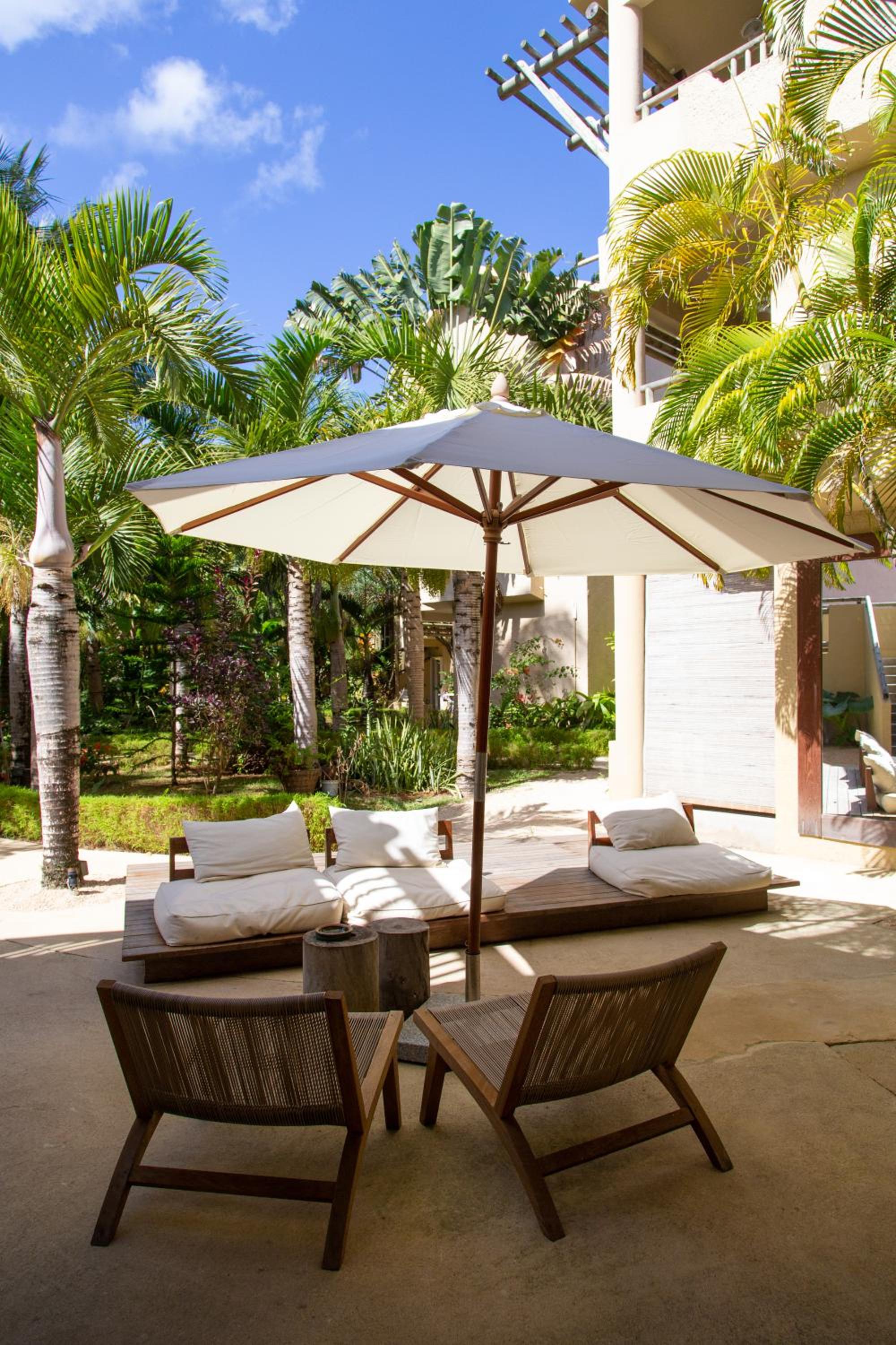 Отпуснете се в буйната градина около открития басейн, където можете да се насладите на слънцето на удобни шезлонги. Съоръженията за барбекю са на разположение за хранене на открито, добавяйки към прекрасното тропическо изживяване.