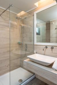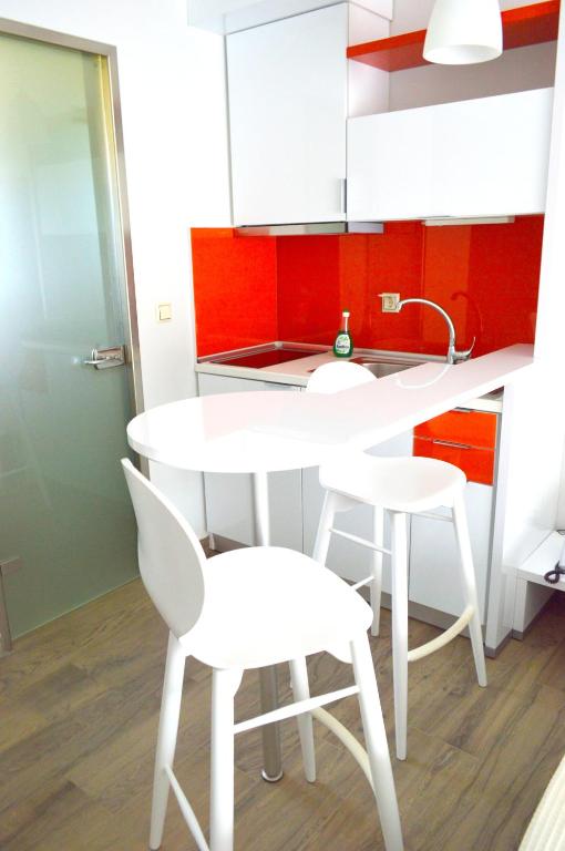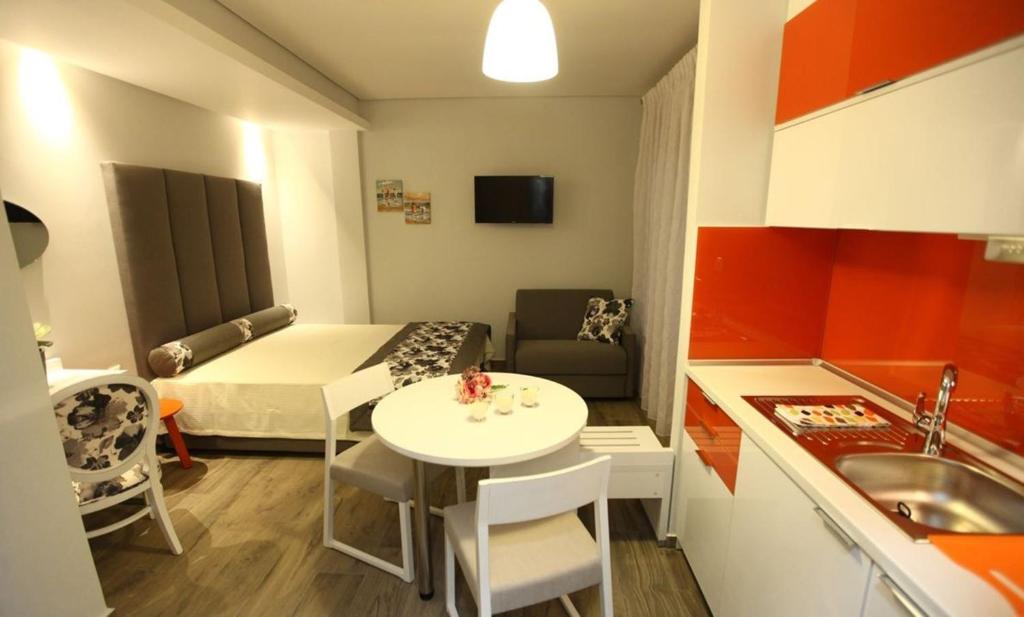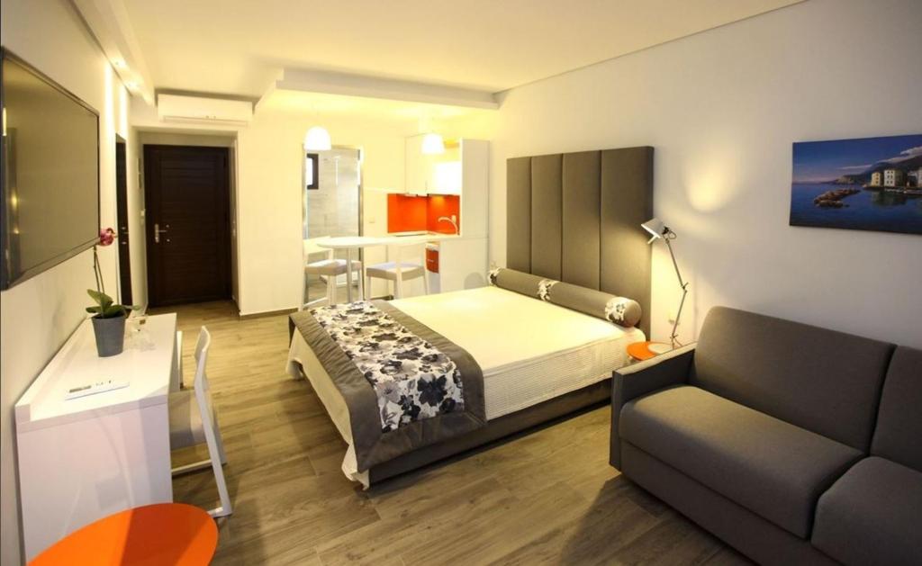 Each modern studio includes air conditioning and a seating area with a flat-screen TV. It has a kitchenette and bathroom with a shower.